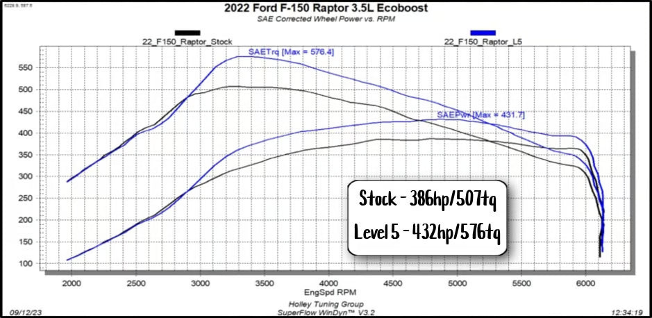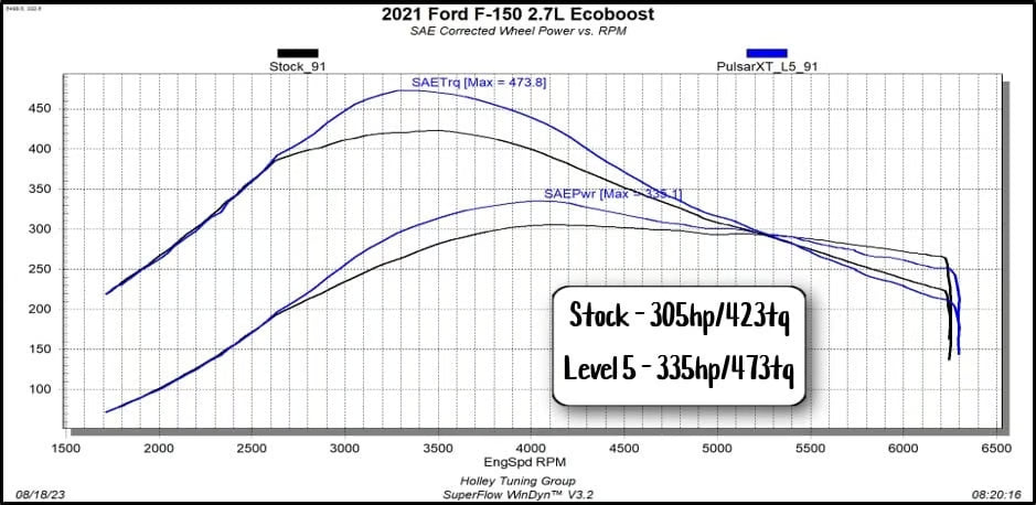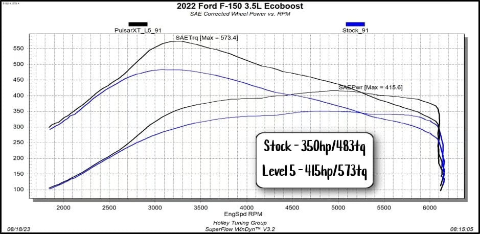 - Adds up to 65hp/90tq at peak to 3.5L and 30hp/51tq for 2.7L, 45hp/68tq for Raptor